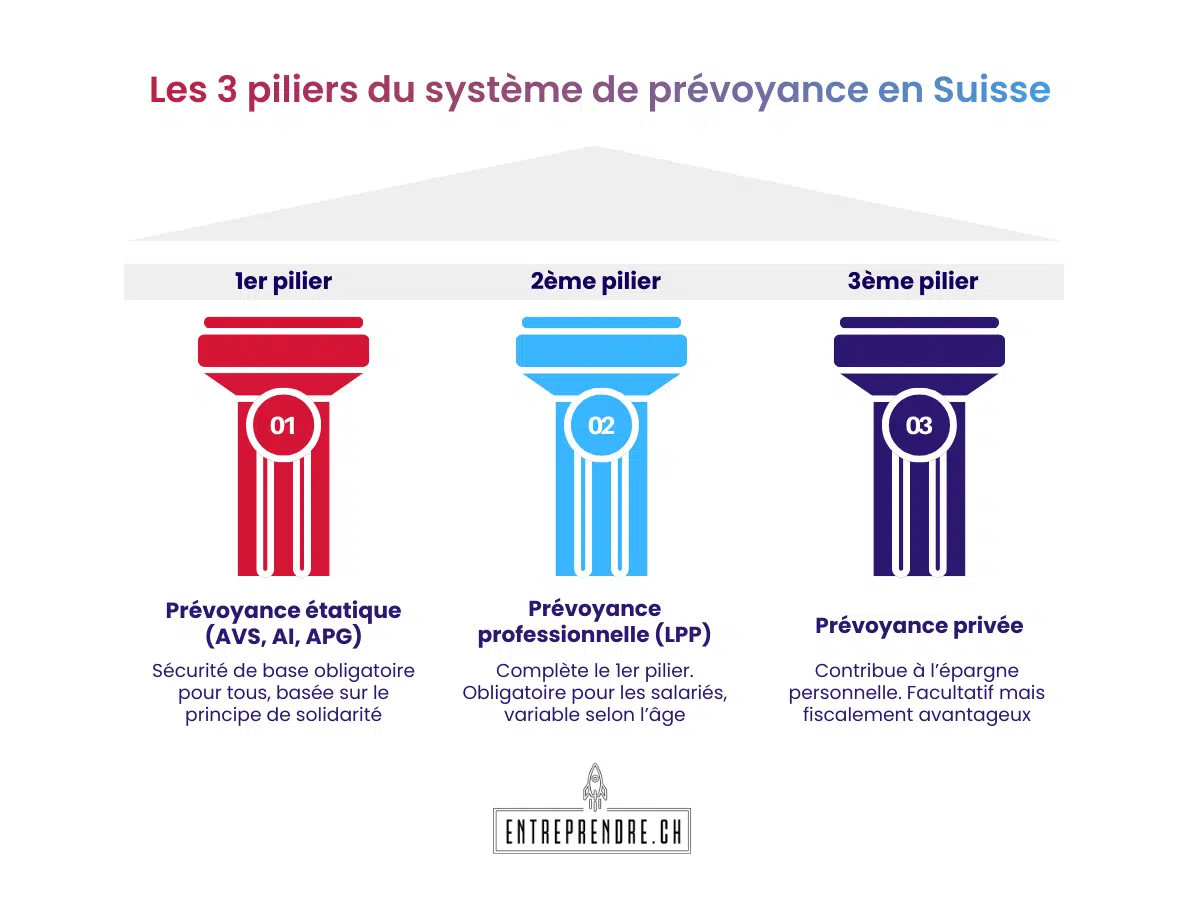 - Le premier pilier : qui inclut les assurances vieillesse (AVS), l’assurance invalidité (AI) et l’assurance perte de gain (APG).