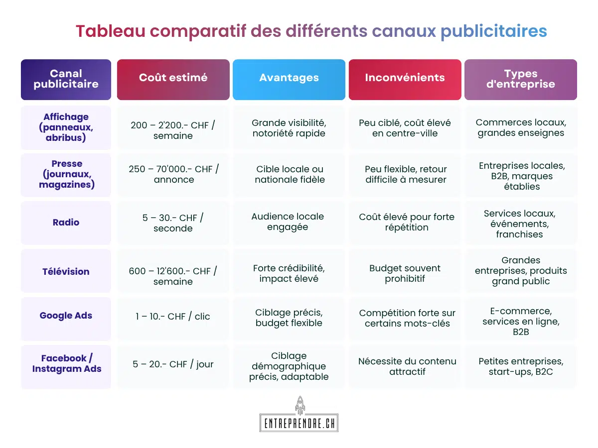 Les prix varient selon le support choisi : un panneau d’affichage coûte entre 180 et 2’200.- CHF par semaine, une annonce presse locale démarre à 250.- CHF, et un spot TV régional peut coûter entre 600 et 1’000.- CHF par jour. Pour le digital, Facebook et Google Ads permettent de commencer avec un budget de 5 à 20.- CHF par jour.